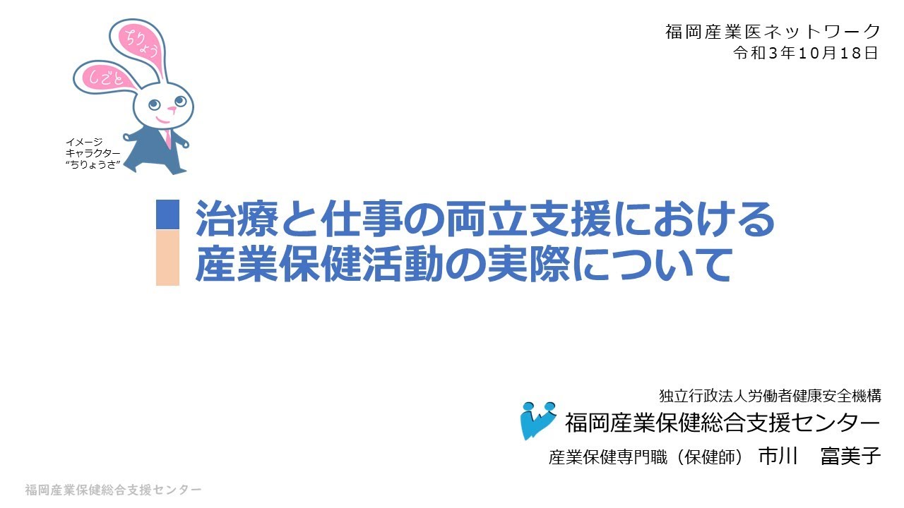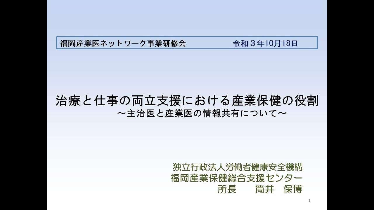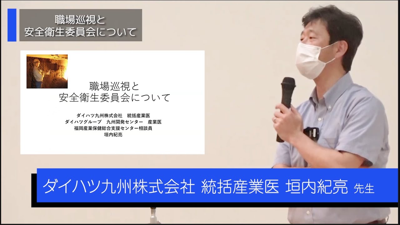 HOME > 研修会動画 特別セミナー 「産業保健におけるロービジョンケア」 医療法人むらかみ眼科医院 副院長 村上 美紀 先生 「視覚障害者就労支援機構の取り組みについて ~産業保健の役割と連携~」 社会福祉法人 日本視覚障害職能開発センター 就労移行支援部長 坂田 光子 先生 特別セミナー 「これからの化学物質管理について 新たな規制が照らし出す化学物質管理の現状と課題 」 産業医科大学 産業生態科学研究所 所長 職業性中毒学研究室 教授 上野 晋 先生 特別セミナー 「治療と仕事の両立支援~主治医でも産業医でも使える就業配慮の考え方~ 」 産業医科大学 産業生態科学研究所 災害産業保健センター 教授 立石 清一郎 先生 第8回特別セミナー 「医師の働き方改革における制度・法令について」 社労士事務所ジェントリー 代表 福岡産業保健総合支援センター 産業保健相談員 吉田 明文 先生 第7回特別セミナー 「職場における健康情報の保護と活用」 産業医科大学 副学長 福岡産業保健総合支援センター相談員 堀江 正知 先生 第6回特別セミナー 「職場巡視と安全衛生委員会について」 ダイハツ九州株式会社 総括産業医 ダイハツグループ 九州開発センター 産業医 福岡産業保健総合支援センター相談員 垣内 紀亮 先生 第5回特別セミナー 「心臓病患者の就学・就労支援~先天性心疾患患者を中心に~」 人間環境大学地域包括医療研究センター長 あいち小児保健医療総合センター名誉センター長 前田 正信 先生 第4回特別セミナー 雄岡病院 精神科医 原口 千代 先生 第3回特別セミナー 一般社団法人gid.jp日本性同一性障害と共に生きる人々の会 九州支部 支部長 黒部 美咲氏 ながの医院 院長 永野 健太 先生 第2回特別セミナー 福岡産業保健総合支援センター 所長 筒井 保博 先生 福岡産業保健総合支援センター 産業保健専門職 (保健師) 市川 富美子 第1回特別セミナー 福岡産業保健総合支援センター アドバイザー産業医 織田 進 先生 産業医科大学産業生態科学研究所 作業関連疾患予防学教授 大神 明 先生 2024年11月27日 author